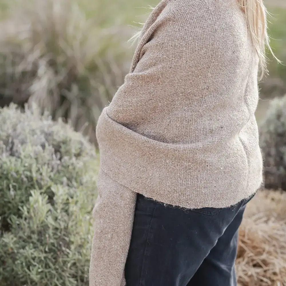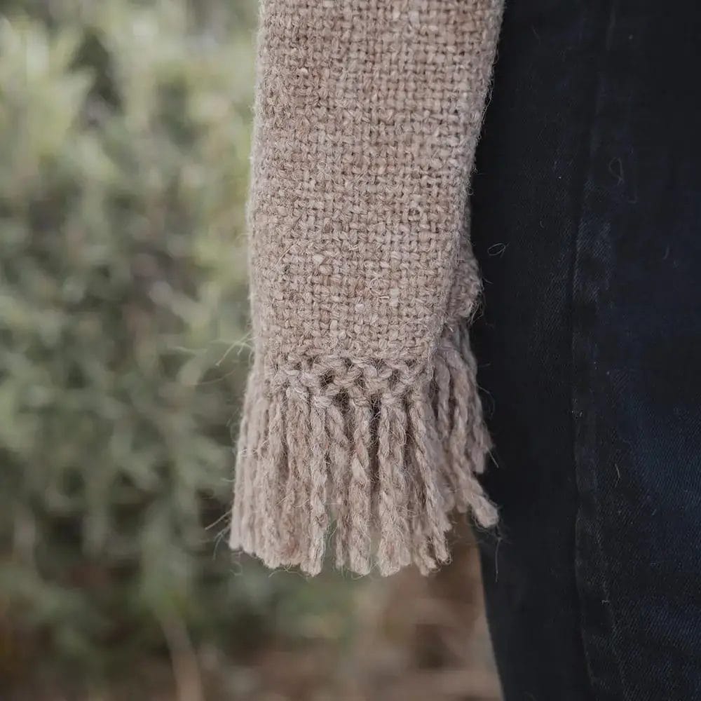 Ruana tejida en lana de llama con color natural de la llama, en color marron. Realizada artesanalmente en telar con la técnica ancestral de telar plantado en el pueblo de Seclantas.